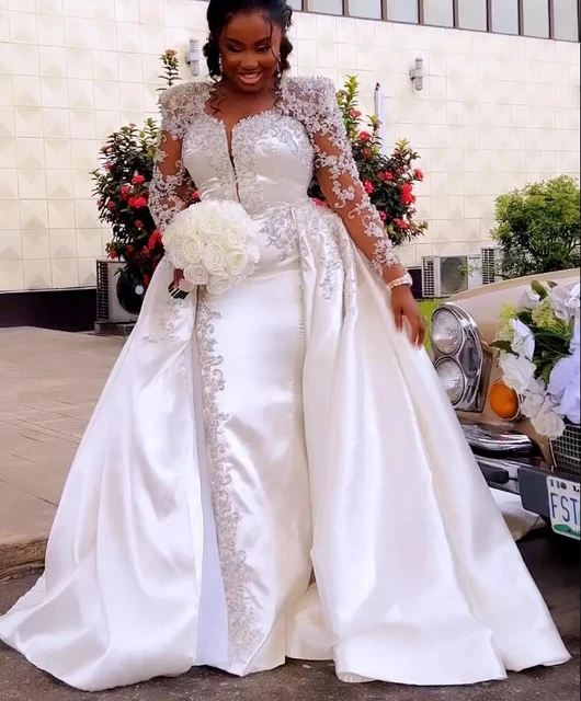 Source : www.arabiaweddings.comLong Sleeve Wedding Dress 2024 Satin Mermaid Detachable Train